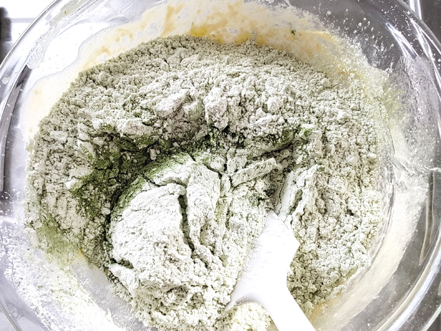 4:薄力粉、抹茶、ベーキングパウダーを合わせてふるい入れ、ゴムベラで練らないように混ぜましょう。