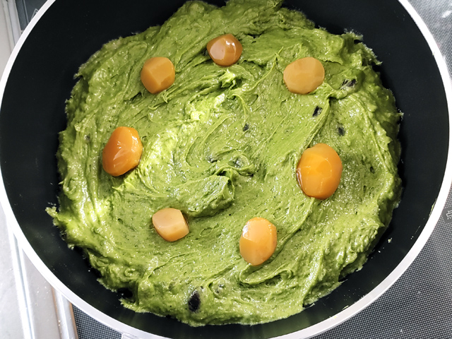 7:オールパンに生地をすくい入れ、平らにならしてから、栗を間隔を空けて置きます。