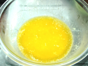 ![]() ①耐熱ボールにバターを入れ、レンジに2分程かけて、完全に溶かします。 (ふつふつと泡立つくらいまで強めに加熱します。) |