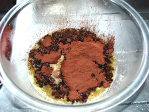 ![]() ②バターが熱いうちに、ココアを加えて手早く混ぜます。 |
