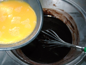 ![]() ④別のボールに卵を溶きほぐし、ココアのボールに少しずつ加えながら、その都度良く混ぜましょう。 |