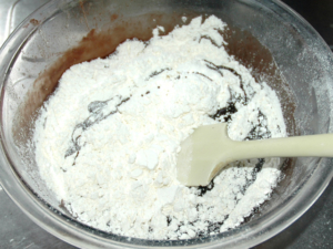 ココアと砂糖は、バターが熱いうちでないと、綺麗に溶けないので手早く行ってください。