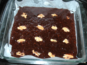![]() ⑥オーブンシートを敷いた型に流しいれ、切ったら16等分になるように、くるみを散らします。 |