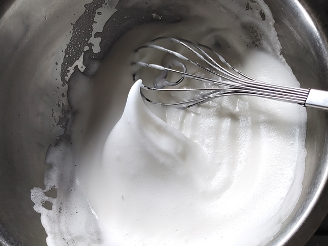 2:卵白に砂糖を一つまみ加えて泡立て始め、途中二回に分けて砂糖を加え、ピンと角が立つまで泡だててメレンゲを作りましょう。