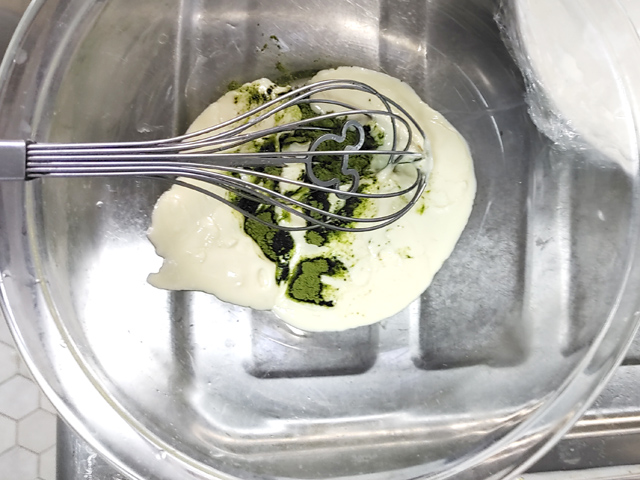 23:液が固まったら、残しておいたクリームを数か所に乗せ、最後に分量外の抹茶を茶こしでふりかけ、完成です。