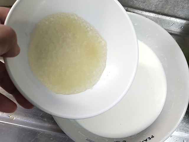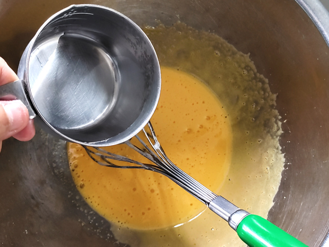 4:卵黄のボールに水を少しずつ加えながら、その都度よく混ぜましょう。