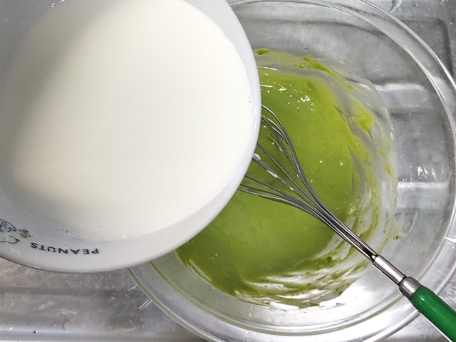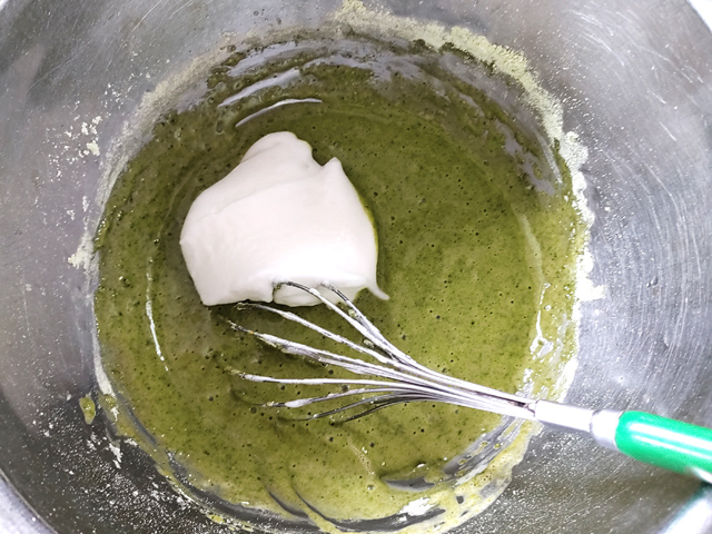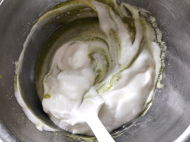6:卵黄のボールに、薄力粉とベーキングパウダー、生地用の抹茶を合わせてふるい入れ、粉っぽさが消えるまで良く混ぜ合わせましょう。