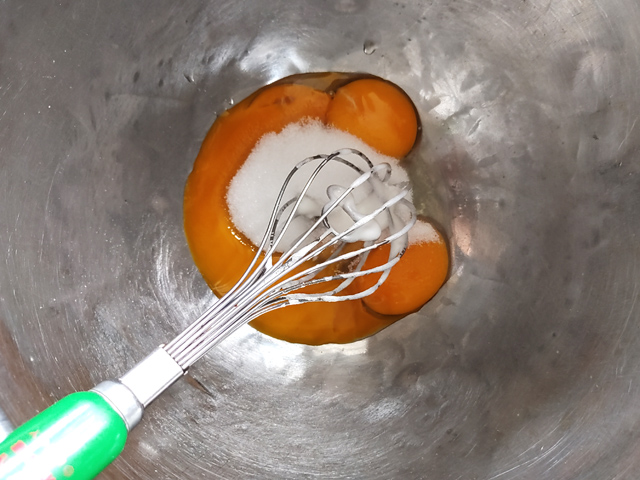 3:卵黄のボールに砂糖を加えて泡立て、白っぽくとろりとするまで泡立てます。