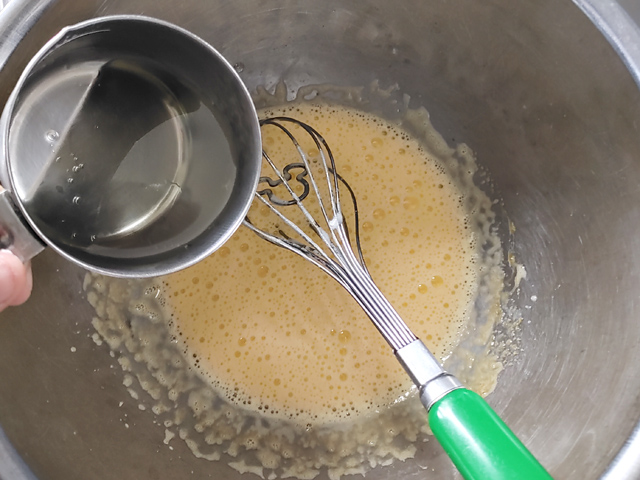 5:サラダ油を少しずつ加えながら、その都度よく混ぜ合わせます。