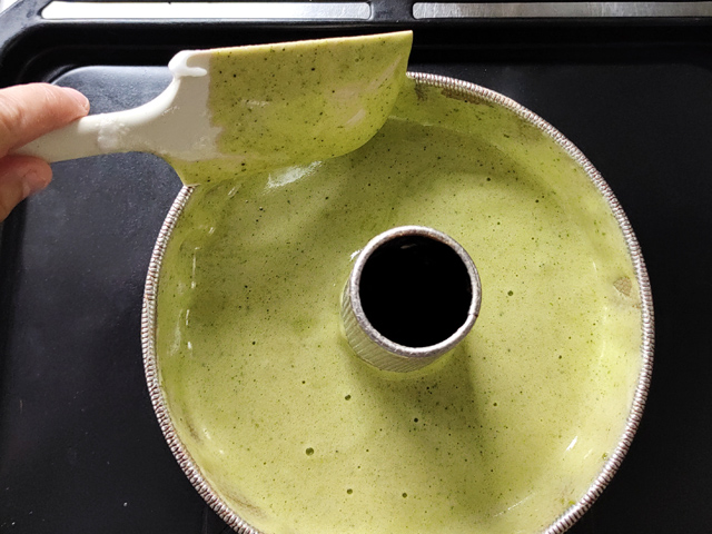 22:ケーキを回転台などの上に乗せ、抹茶のゼラチン液(グラサージュ)を回しかけます。