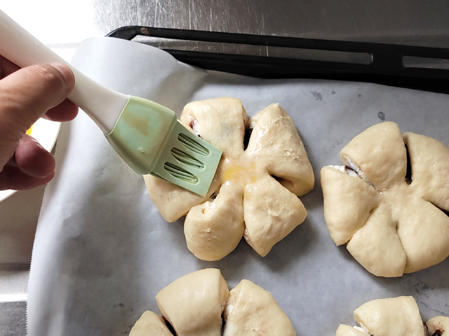 17:生地の上に刷毛で溶き卵(残しておいた分)を塗り、中央にゴマ(分量外)を乗せます。