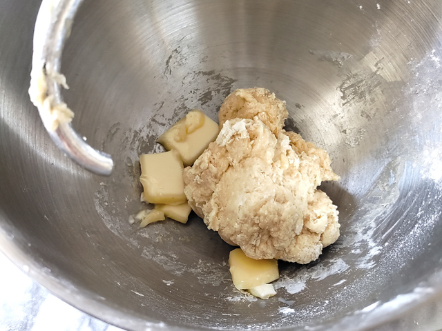 3:低速で捏ねて、生地がまとまってきたら、レンジで10秒ほど加熱したバターを加え、再度低速で捏ねます。