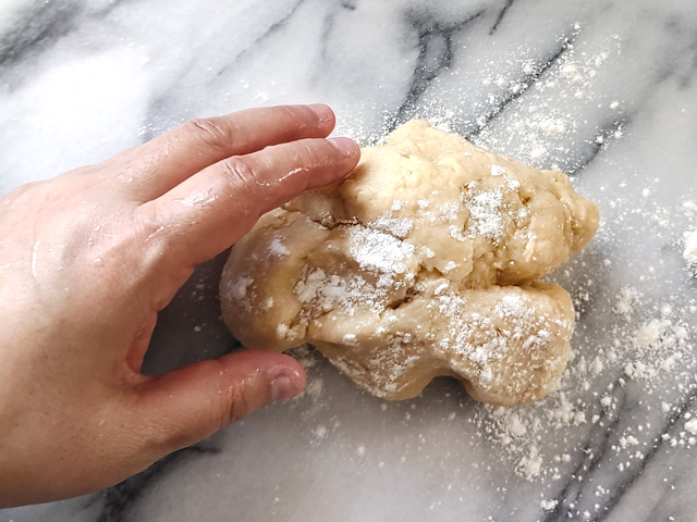 12:生地を1つ取り、めん棒などで軽く潰して平らにしたら、カードなどで5カ所切れ目を入れましょう。