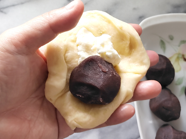 10:1つずつ生地を伸ばし、こしあんとクリームチーズを6等分したものを乗せたら、閉じ目をしっかりとつまみましょう。
