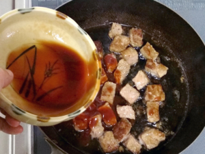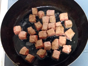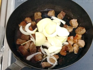 ![]() ①フライパンに薄く油(分量外)を引き、サイコロステーキの全面に焼き色を付けます。 |