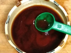 ![]() ③トマトケチャップ、ウスターソース、醤油、酒は混ぜ合わせ、ソースを作っておきます。 |