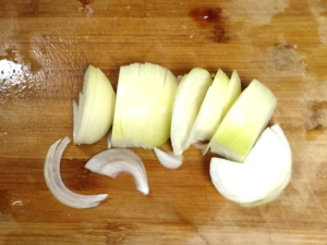 ![]() ④玉ねぎは皮をむいて、薄切りにします。 |