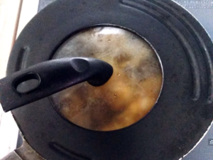 ![]() ⑦また蓋をして、弱火で2~3分蒸し焼きにしましょう。 (玉ねぎに早く火が通ります。) |