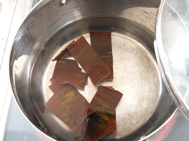 1:小鍋に、水と昆布を入れて、室温で10分ほど置きます。