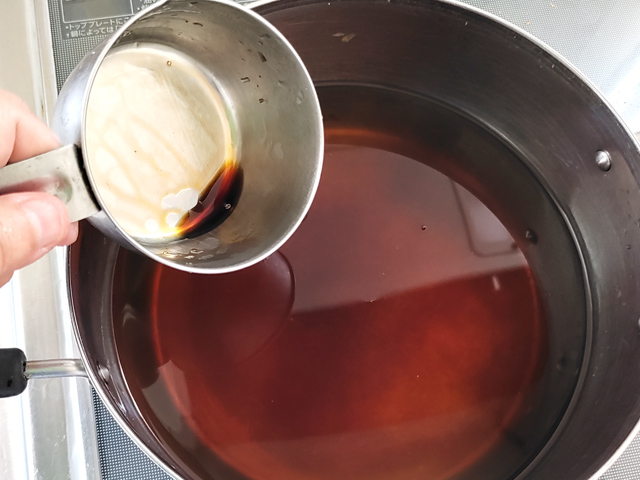 4:鍋に、こした出し汁を戻し入れ、みりんと醤油を加えて、再度沸騰させましょう。