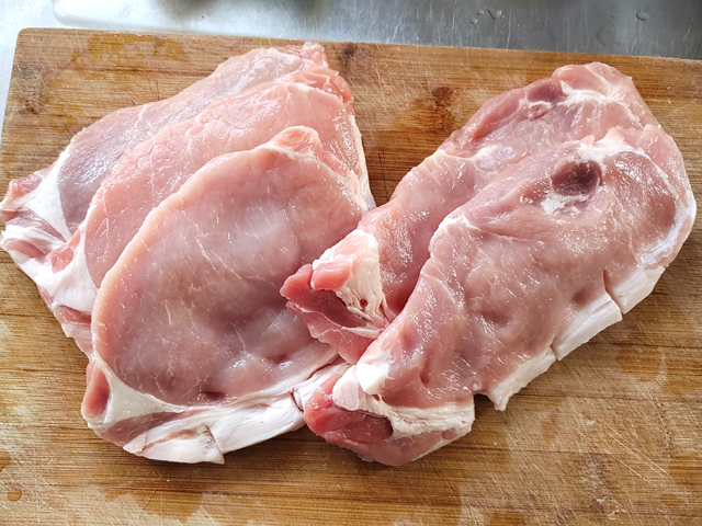 6:豚肉は、身と脂身の間に垂直に切り込みを入れましょう。