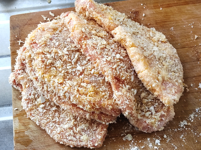 7:豚肉に、薄力粉→卵を溶いたもの→パン粉の順に衣をつけます。