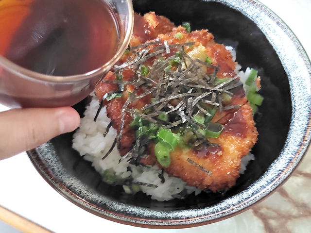 9:器にご飯を盛りつけ、カツを食べやすく切ったものを並べ、上にトンカツソースを1人分かけ、更に上に刻んだネギと刻み海苔を散らし、ゆずコショウを絞ったら、上から、だし汁をかけます。