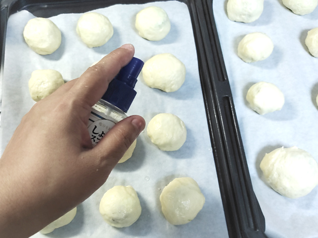 14:全ての生地を包み終えたら、天板にクッキングシートを敷き、生地の上から、それぞれ霧吹きで水を2回ほどプッシュします。