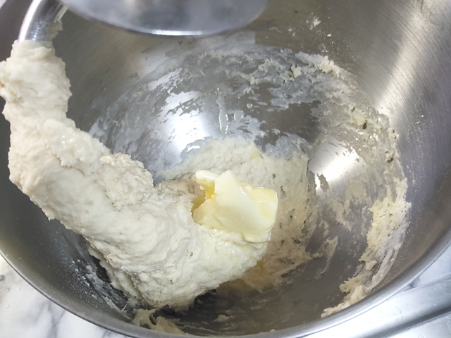 4:生地がまとまってきたら、レンジで10秒ほど加熱して、柔らかくしたバターを加え、さらに低速で捏ねましょう。