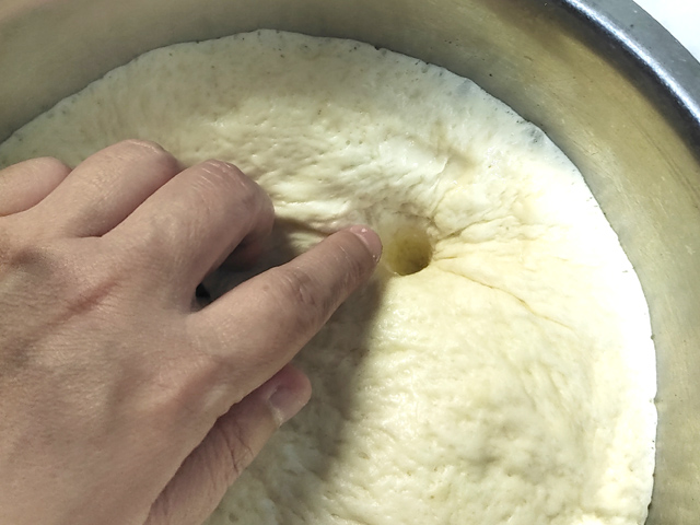 9:生地に指を挿してみて、戻ってこないようなら、一次発酵完了です。