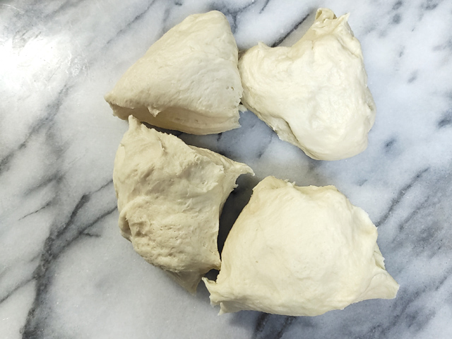 10:生地にパンチをして、ガス抜きをしたら、まずカードなどで、4等分に切り分けます。
