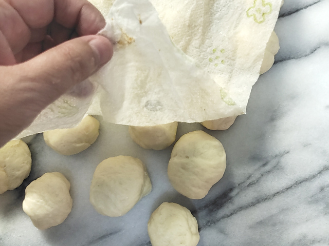 12:カットした生地を全て丸めたら、水で濡らして固く絞った布巾を乗せ、15分ほど置きます。