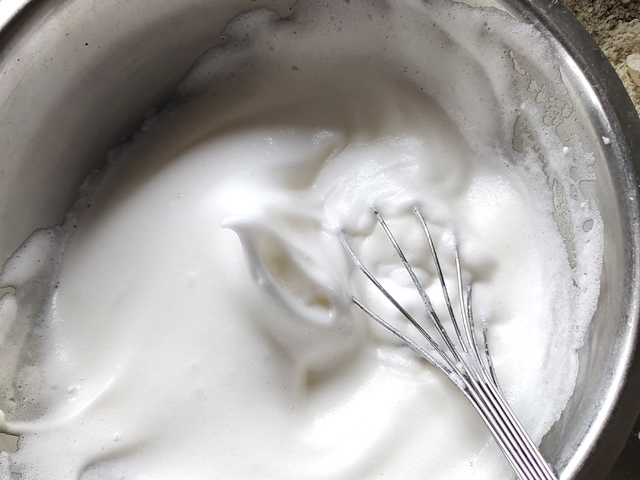 2:卵白に砂糖を一つまみ加えて泡立て始め、途中二回に分けて砂糖を加え、ピンと角が立つまで泡だててメレンゲを作りましょう。