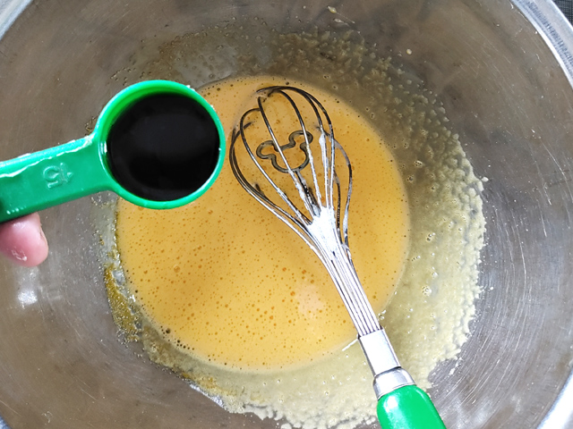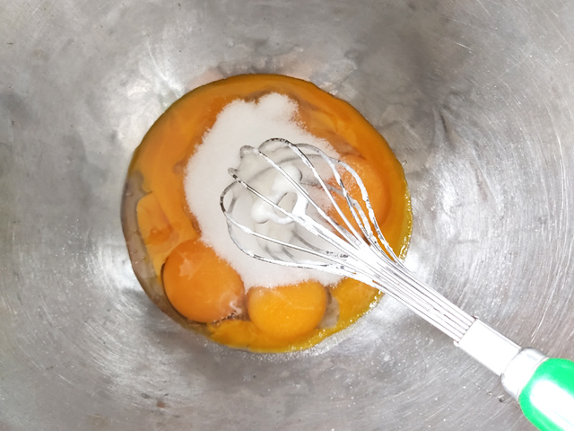 3:卵黄のボールに砂糖を加えて泡立て、白っぽくとろりとするまで泡立てます。