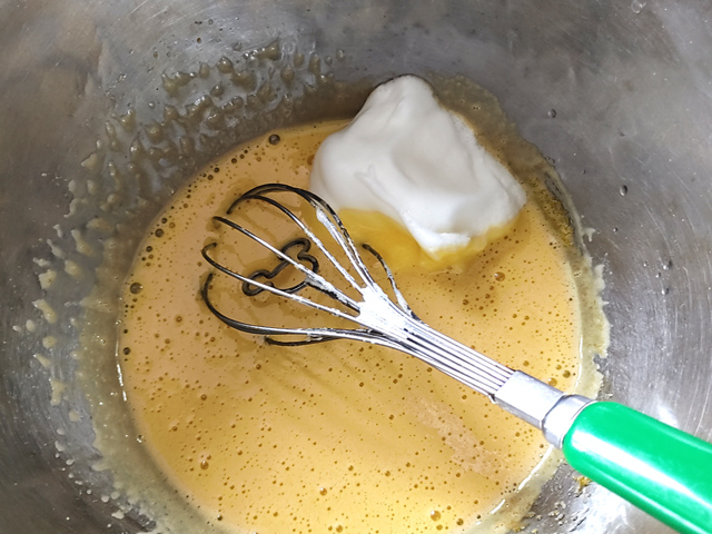 6:卵黄のボールにメレンゲをひとすくい加え、なじむまで混ぜます。