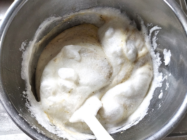 8:卵黄のボールにメレンゲを全量加え、ゴムべらに持ち替えて、さっくりと練らないように混ぜます。