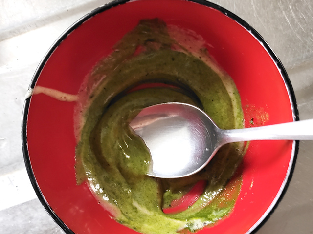 5:生地用の抹茶とお湯を溶かしたものを、大1ずつ入れ、その都度よく混ぜましょう。