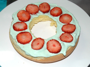 ![]() ⑯ケーキの表面全体に緑のクリームを塗り、上にデコレーションの苺とクリームを飾ります。 ⑰完成です。 |