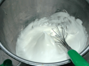 ![]() ③卵白に砂糖をひとつまみ加えて泡立て始め、途中クリーム状になったら、残りの砂糖を二回に分けて加え、ピンと角が立つまで泡立てます。 |