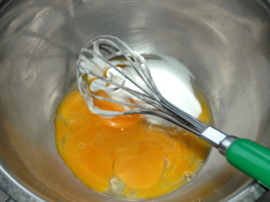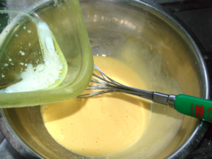 ![]() ⑤卵黄のボールに、牛乳とサラダ油の混合液を少しずつ加えて、その都度良く泡立てましょう。 ⑥卵黄のボールに、メレンゲを少量加え、良く混ぜます。 |