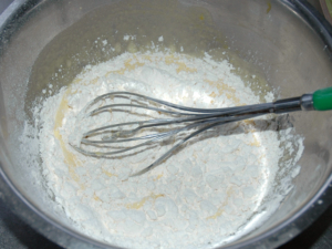 ![]() ⑦薄力粉をふるい入れ、粉っぽさが無くなるまで混ぜます。 |
