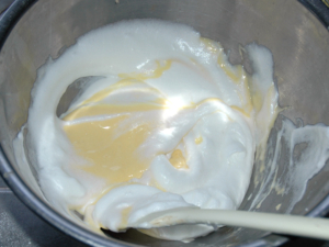 ![]() ⑧メレンゲのボールに、卵黄の中身を全て入れ、ゴムべらに持ち替えて、さっくりと練らないように混ぜましょう。 |
