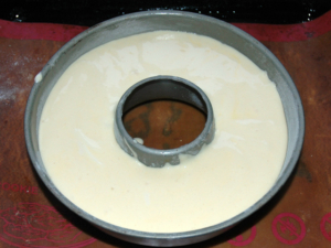 ![]() ⑨ケーキ型を冷蔵庫から取り出し、強力粉(分量外)を内側全体にまぶし、余分な粉は落とします。 ⑩ケーキ生地を流し入れ、上からトントン落として大きな気泡を取り除きましょう。 |