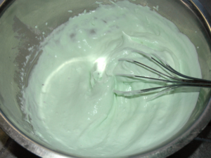 ![]() ⑪焼いている間に、★緑のクリームの材料をボールに入れて泡立て、8分立てくらいの固さになったら、冷蔵庫に入れておきます。 |