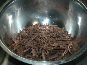 ![]() ①チョコは細かく刻んで、ボールに入れておきます。 |