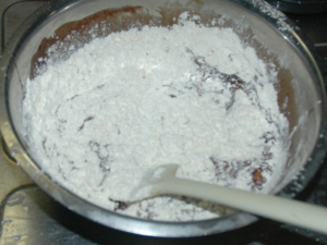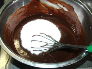 ![]() ④チョコが熱いうちに、砂糖を全量加え、ザラザラがなくなるまで混ぜます。 |