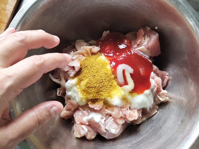 2:ボールに鶏肉、コンソメ、塩、ヨーグルト、カレー粉、ケチャップ、生姜、にんにくを入れて、良く混ぜ合わせましょう。