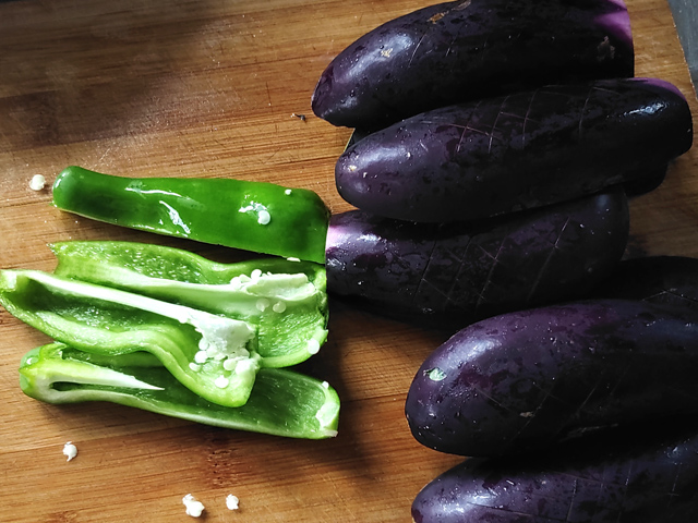 4:ナスはヘタを取り、縦半分に切り分けましょう。