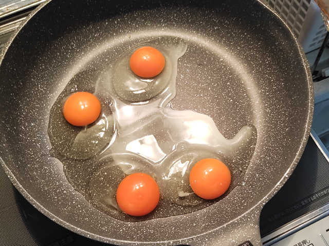 5:フライパンで、完熟の目玉焼きを4個作ります。
