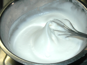 ②卵白に砂糖を一つまみ加えて泡立て始め、途中二回に分けて砂糖を加え、ピンと角が立つまで泡だててメレンゲを作りましょう。